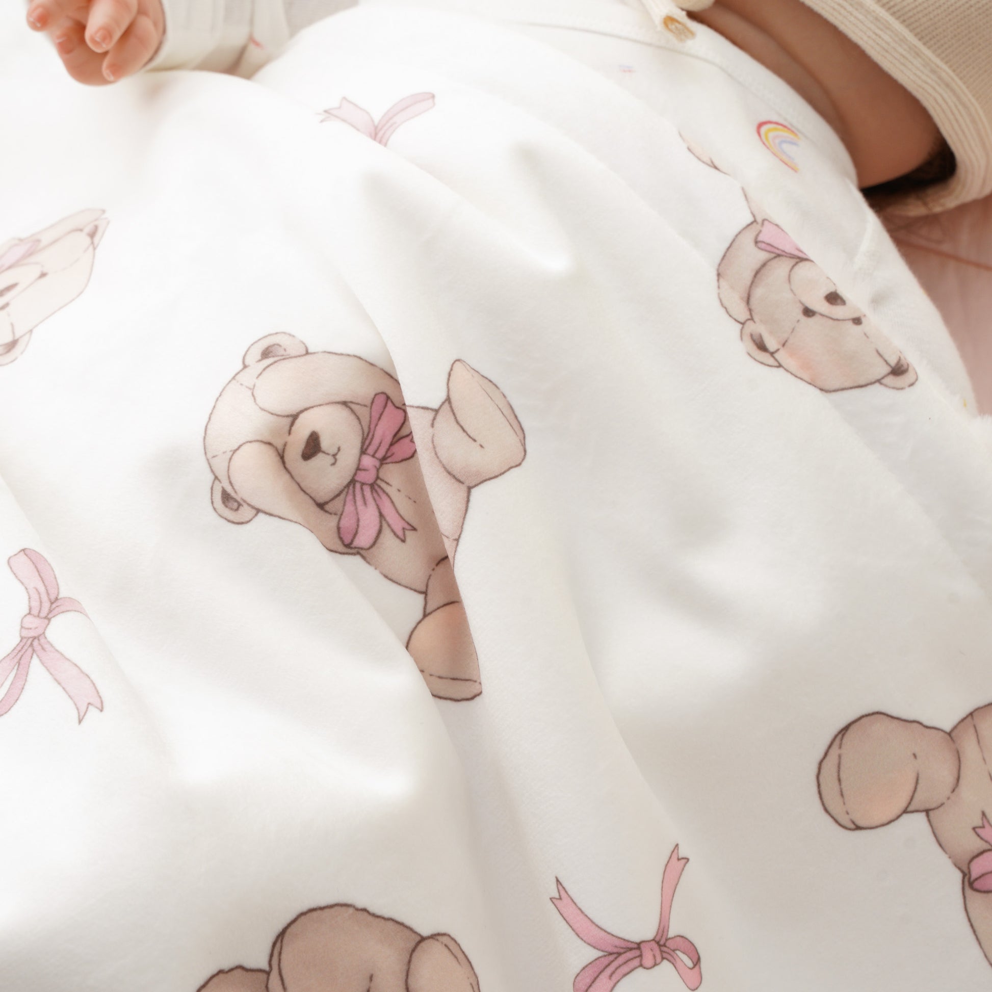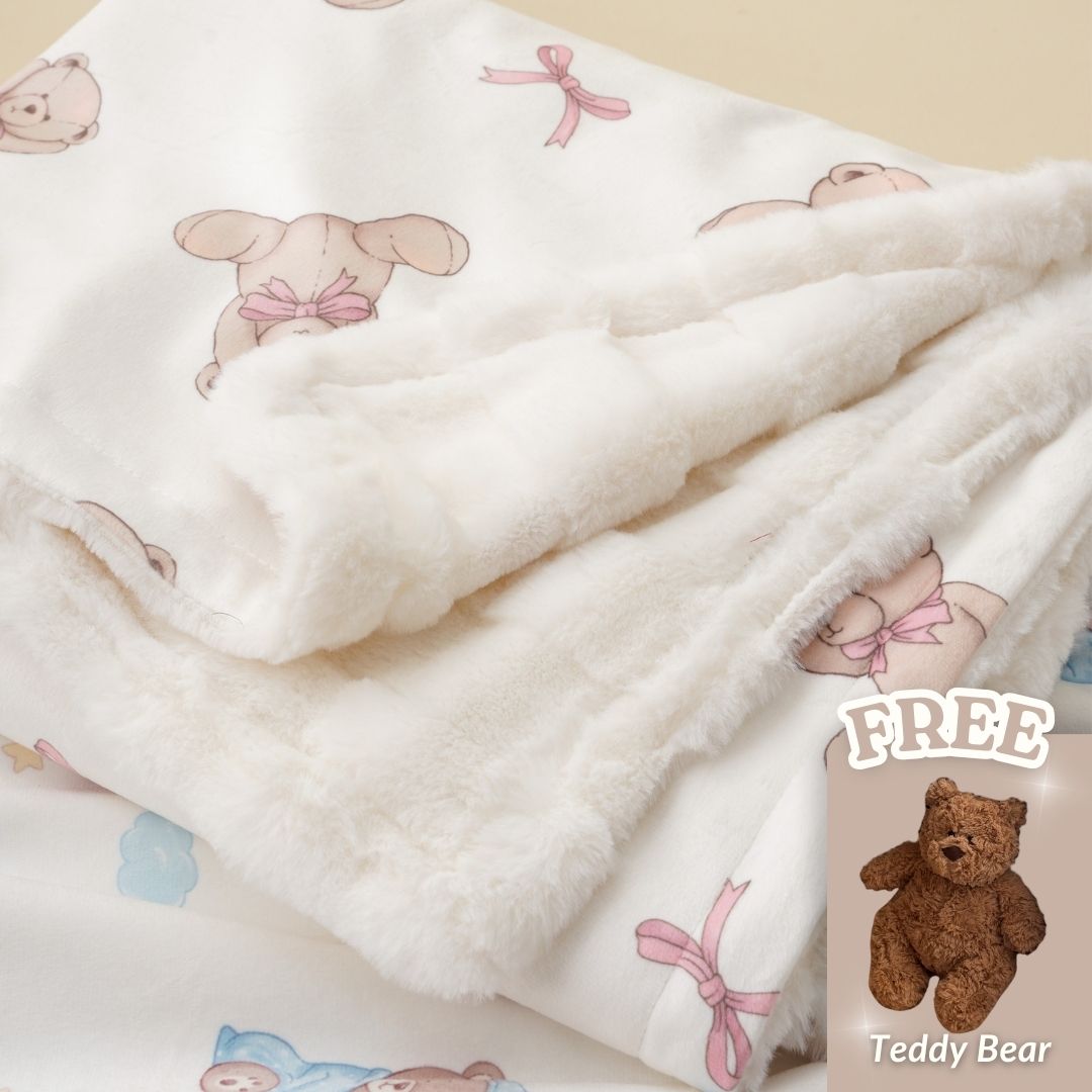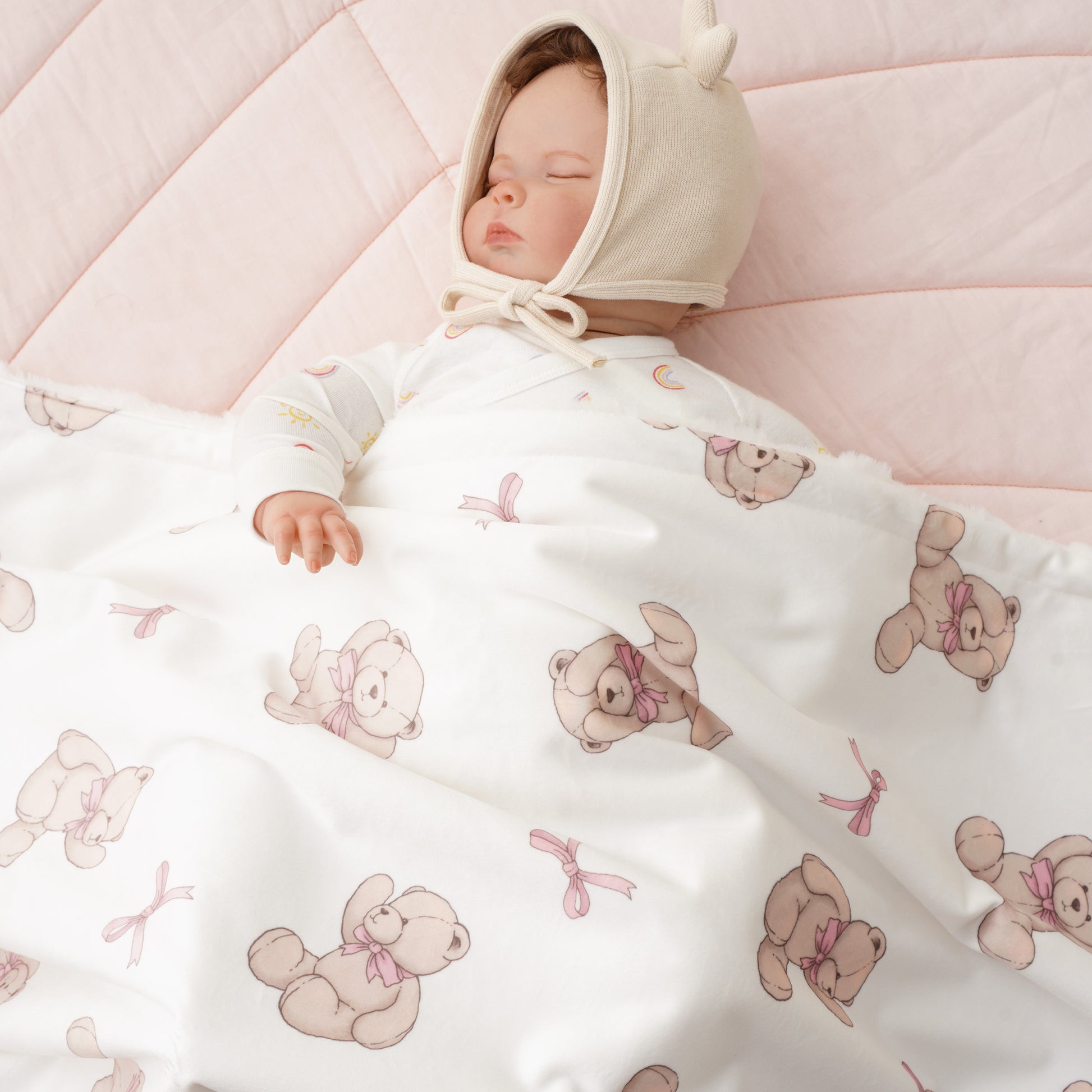 Wrap your little one in all the love with Rosie Bear Hug, our sweetest blanket adorned with soft pink bows and cuddly teddy bears. Printed on velvety micromini and backed with ultra-plush faux fur, it’s made for cozy snuggles, tummy time, or naps on the go.